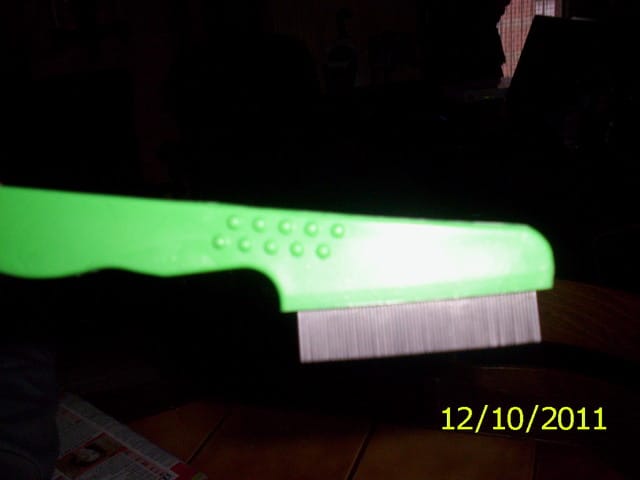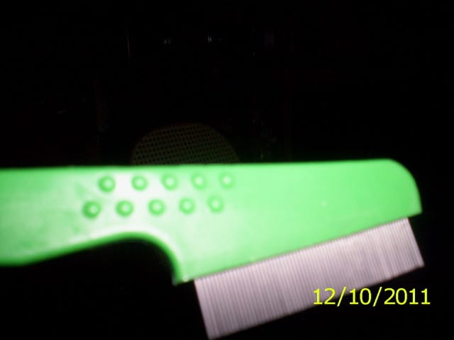 je suis allee hier acheter des produits chez mon veto et on parlait de stessy car comme elle est petite on ne peut pas lui faire de pipettes avant qu elle ai 6 semaines aussi il m a vendu un peigne specialqui attrappe les puces il est en mettal et fait comme un raclette il coute que 23 euros sur la photo c est le vert il faut un poil assez court ce matin je l ai passe sur stessy bien a plat comme le veto m a dit et bien c est genial