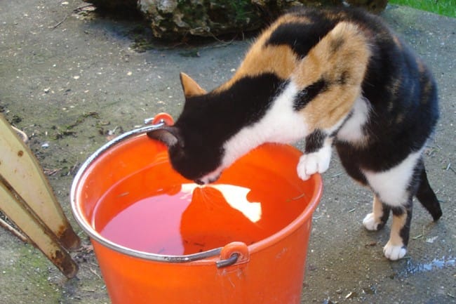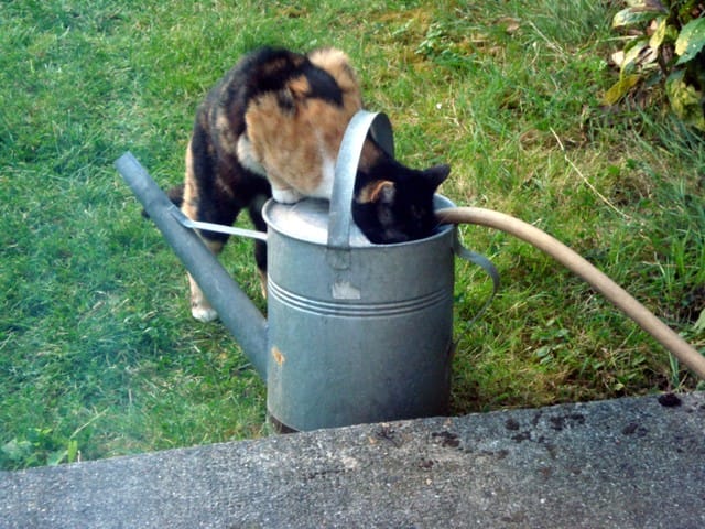 et pour al faire boire, je lui ouvre tout doucement le jet d'eau sur la terrasse, et elle lèche. Elle a l'habitude maintenant elle attend devant le tuyau.