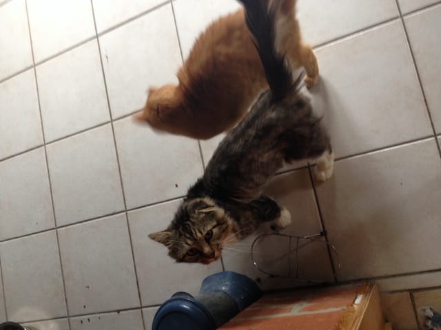 Je compte demander au vétérinaire tantôt mais si vous pouviez me rassurer (ou pas). Il est toujours dans le garage avec un de mes chats mais ils ne s'approchent pas, l'un dort en hauteur et l'autre par terre ..