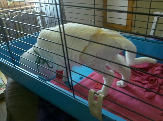 Nous la rentrons, la mettons dans la caisse de transport et appelons notre vétérinaire de notre arriver en urgence...