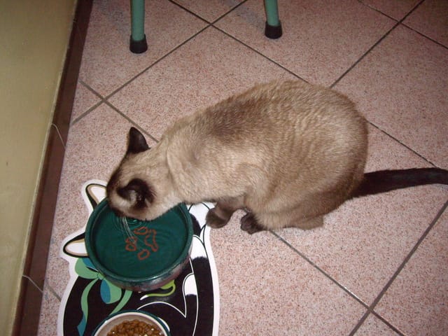 On le sait, le chat boit peu, trop peu. Résultat, il est sujet à tout un lot de problèmes urinaires (cystites, calculs, insuffisance rénale...). Personnellement j'ai de la chance, Félia boit beaucoup pour un chat, pour info elle me fait deux gros pipis par jour. Mais elle ne boit pratiquement pas dans son ramequin d'eau. C'est soit dans un verre que je laisse toujours à son intention rempli d'eau fraîche dans l'évier, soit la plupart du temps dans un vase de la bibliothèque, dont je change aussi l'eau quotidiennement. Attention, un vase sans fleurs bien sûr. A l'origine ce vase rempli d'eau était destiné à humidifier l'atmosphère de mon appart (chauffage au sol donc air très sec), mais ma louloute a vite fait de se l'approprier comme verre géant. J'en déduis que pour faire boire son chat, il faut lui mettre de l'eau à des endroits insolites ;)