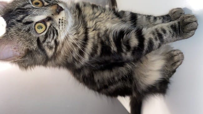 Je vois un très beau chaton tigré, probablement un bon gabarit et un poil bien fourni quand il sera adulte. Mais un Maine coon, j'ai aussi des doutes...