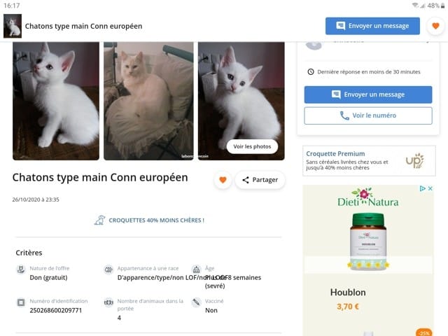 C'est une annonce trouvée sur le bon coin, le chaton n'est pas vacciné et elle demande 250 euros