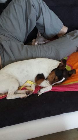 Ensuite une autre de mes stratégie fut de jouer avec les 2 ensemble. Toujours lorsque le chien est calme, et généralement sur mon lit.