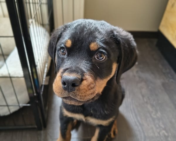 Au vu de la race Rottweiler il est catégorisé (catégorie 2). Il devra donc obligatoirement sortir muselé et attaché comme le veux la loi. L'apprentissage du port de la muselière sera donc à faire.