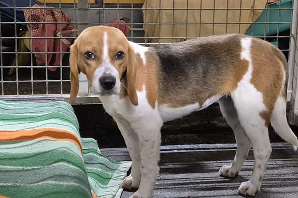 Chasy est un craintive petite beagle qui nous vient de fourrière. Pour le moment tout l'effraie mais avec un peu de temps, elle finira par se détendre.