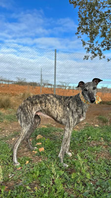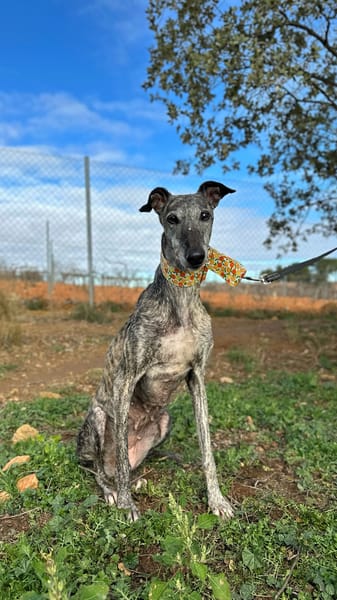 C'est une galga incroyablement affectueuse, câline et douce. Elle s'entend bien avec les autres chiens et marche bien en laisse même si certains bruits l'effrayent encore.