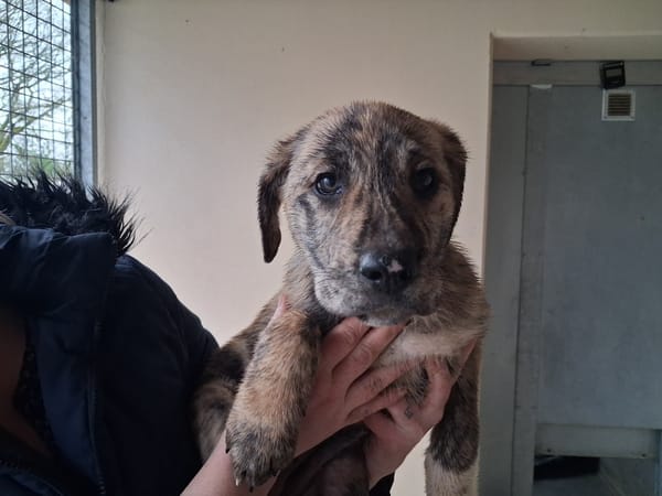 Cette portée de chiot a été abandonnée sur le parking du refuge il y a un mois. L'une de nos famille relais a veillé sur la fratrie, aujourd'hui âgés d'un peu plus de 2 mois, ils sont à l'adoption. Leur taille adulte sera grande, les vétérinaires ont estimé un croisement avec la race cane corso. Très joueuse, elle était la leader de sa fratrie