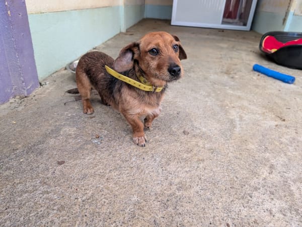 Nouille est une petite teckel un peu timide mais très gentille. elle s'entend très bien avec ses congénères.