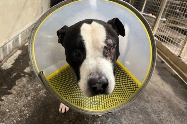 Eduardo est une pauvre misère que nous avons récupéré via la fourrière. Ce papy a cruellement manqué de soin et a été trouvé avec une plaie béante au cou (de la taille d'une orange) et un oeil tellement abîmé qu'on a du lui retirer.