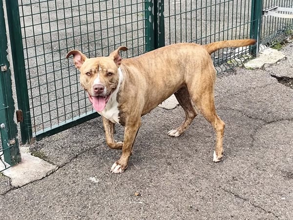 Cette adorable molosse est en réalité une vraie guimauve sur pattes ! Derrière son look impressionnant se cache une chienne ultra douce, câline et complètement accro aux papouilles.
