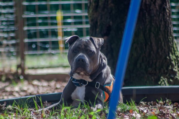 Vous recherchez un chien calme mais sachant être dynamique? Me voici Juice!!! Je suis un staff bleu lof donc je suis un chien de 2eme catégorie, il faudra donc quelques papiers supplémentaires pour mon adoption! Affectueux, je souhaite avoir l'exclusivité de l'amour de mes maîtres. J'espère vite trouver une famille qui me donnera tout la tendresse dont j'ai besoin