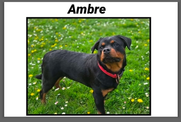 Ambre est arrivée en abandon , elle vivait avec un autre chien de la même race . Suite à un signalement , les chien nous ont été confié.