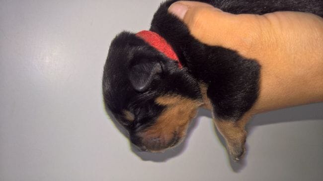 Les oreilles de rotts de moins d'une semaine sont minuscules et rondes, plaquées contre le crâne. Là elles sont déjà bien détachées et triangulaires.