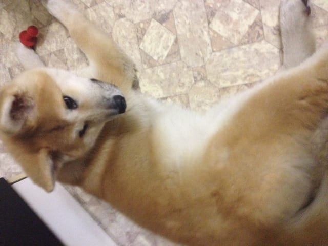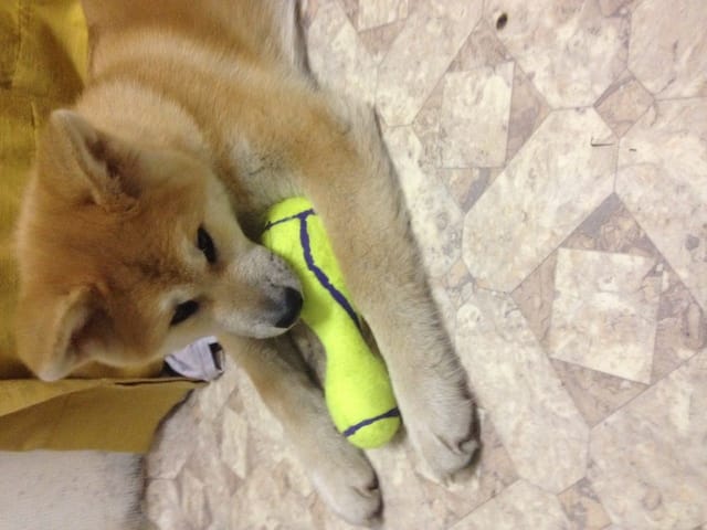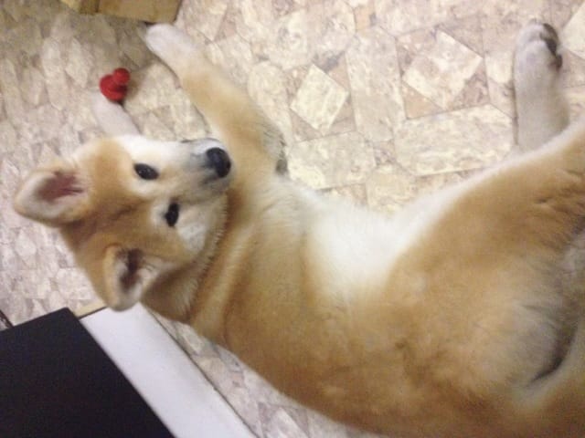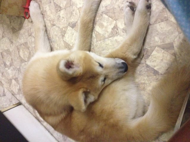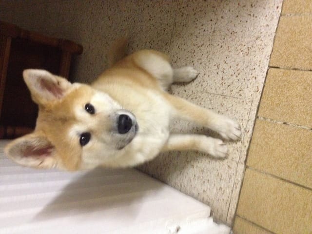 Voilà la petite chérie arrivée chez moi avec un jour d'avance ! Elle est très calme et visiblement assez déprimée d'avoir quitté ses amis. Le premier contact avec mon chat n'a pas été très sympathique, Ayume est très sociable a première vue elle a été lui dire bonjour mais mon chat apparemment n'a pas apprécié ! Coup de patte avec griffure et couinement de mon chien ! J'ai eu très mal au coeur sur le coup… mon chat a été se réfugier en haut, elle est a présent a plus d'un mètre du chien et elle l'observe, j'espère que ça s'arrangera.