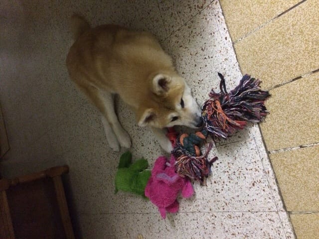 Voilà la petite chérie arrivée chez moi avec un jour d'avance ! Elle est très calme et visiblement assez déprimée d'avoir quitté ses amis. Le premier contact avec mon chat n'a pas été très sympathique, Ayume est très sociable a première vue elle a été lui dire bonjour mais mon chat apparemment n'a pas apprécié ! Coup de patte avec griffure et couinement de mon chien ! J'ai eu très mal au coeur sur le coup… mon chat a été se réfugier en haut, elle est a présent a plus d'un mètre du chien et elle l'observe, j'espère que ça s'arrangera.