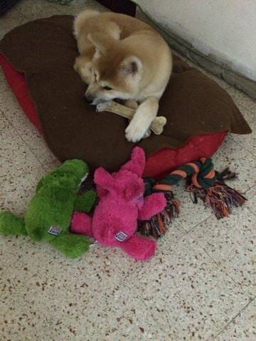 Voilà la petite chérie arrivée chez moi avec un jour d'avance ! Elle est très calme et visiblement assez déprimée d'avoir quitté ses amis. Le premier contact avec mon chat n'a pas été très sympathique, Ayume est très sociable a première vue elle a été lui dire bonjour mais mon chat apparemment n'a pas apprécié ! Coup de patte avec griffure et couinement de mon chien ! J'ai eu très mal au coeur sur le coup… mon chat a été se réfugier en haut, elle est a présent a plus d'un mètre du chien et elle l'observe, j'espère que ça s'arrangera.