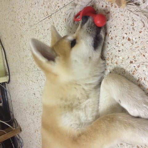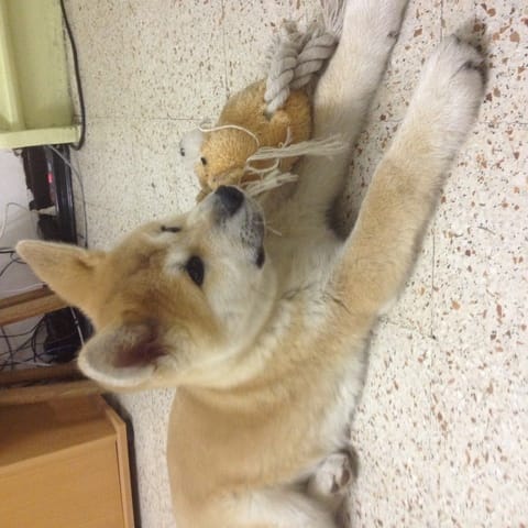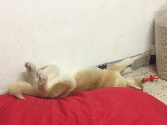 Voilà la petite chérie arrivée chez moi avec un jour d'avance ! Elle est très calme et visiblement assez déprimée d'avoir quitté ses amis. Le premier contact avec mon chat n'a pas été très sympathique, Ayume est très sociable a première vue elle a été lui dire bonjour mais mon chat apparemment n'a pas apprécié ! Coup de patte avec griffure et couinement de mon chien ! J'ai eu très mal au coeur sur le coup… mon chat a été se réfugier en haut, elle est a présent a plus d'un mètre du chien et elle l'observe, j'espère que ça s'arrangera.