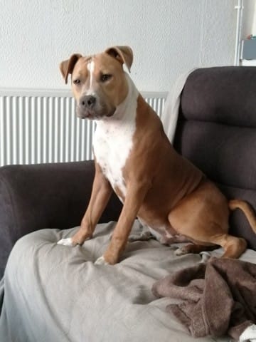 Voilà j’ai un american staff blue fawn de bientôt 10 mois, doux comme un agneau, très joueur, bref j’en suis complément gaga 😁
