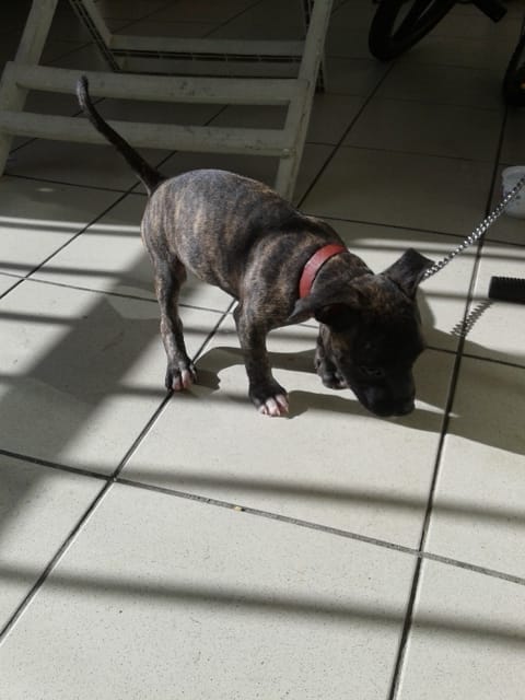 salut cela fait 2 semaines que g trouver ce chiot errant dans notre jardin. mon frère et moi avons decidé de le garder une question nous tourmentes!!! quelle est sa RACE! moi jdit Staff et lui il dit staff croisé(a cause de sa petite taille) mais il ne sait pas quoi on pense aussi que le chien est âgé de 4 mois mais il fait très petit (genre nos amis nous sortent ho? ! depuis quand vous avez un chihuahua-_-) ont a pas encore eu le temps de passer chez le véto :'( help please!
