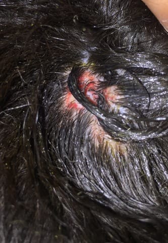 N'hésitez pas à tondre large autour! Plutôt que de la bétadine, lavez les plaies au savon de Marseille avec un gant. Vous rincez bien. Ensuite vous attendez au moins un quart d'heure que ce soit vraiment sec et vous appliquez sa crème( c'est bon c'est à base de Cortisone). OK? Ça va aller! Donnez des nouvelles. Merci!