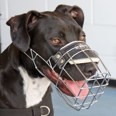celle en cuir ou en cage je connait pas j'en et une en tissu je m'en plein pas apres ces n'est pas pour eviter a ma chienne de mordre ces pour que les gens ne vienne pas les toucher a chaque fois donc si elle le voudrait elle pourai je pense enlever facilement celle en cage d'apres ce que je vois ce les serre pas je pense que celle ci serai parfaite