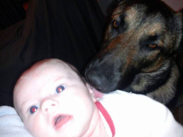 - 3 : L'arrivé : il faut laissé le chien sentir le bébé.... oui mais voilà Harkos BA * malinois de 1 an (très énergique) était très excité et un peu violent c'était difficile de le laissé faire (surtout les grosses léchouilles sur le visage d'un bébé d'une semaine lol)