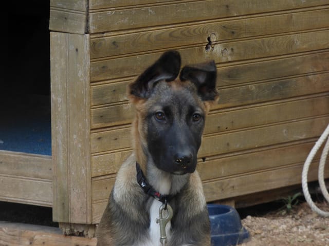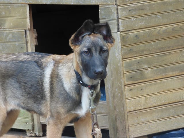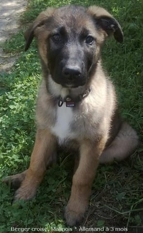 Bref, un chiot de 2 mois et demi à la carrure athlétique, la gueule noire museau fin et une robe fauve très charbonnée possédant une belle tâche d'un blanc pur sur le poitrail.