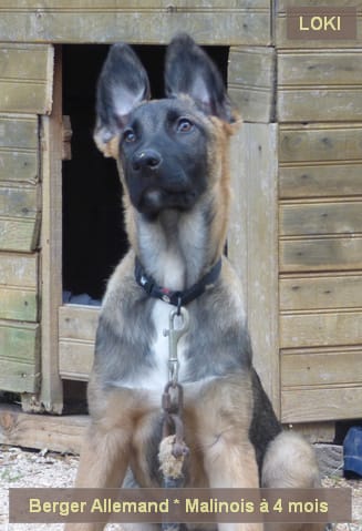 Je me nomme Loki, je suis une femelle issue d'un croisement entre un berger allemand (ma mère) très grosse (costaud) de couleur yellow (je trouve cela bizarre car pas la robe classique noir et feu) et d'un berger malinois (mon père) qui est peut-être pas pure race.