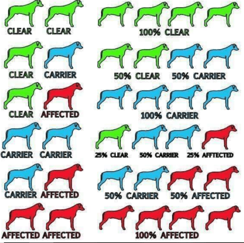 Là, les chiots partagent les mêmes gênes, donc ont les mêmes chances de développer un problème de santé ou non; mais comme certains chiots ont du blanc envahissant, on sait que ces "chances" sont + élevées que pour une portée sans blanc envahissant.