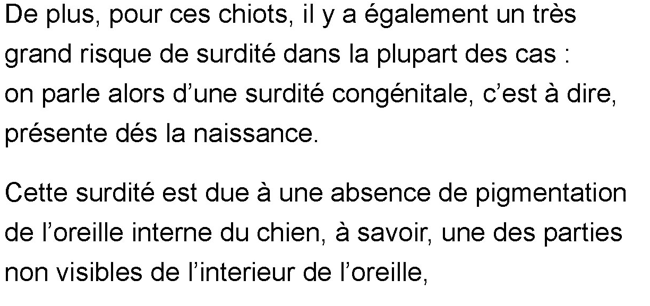 "Un chien ayant les oreilles entièrement blanches (indication que les mélanocytes n'ont pas migré jusqu'a cette partie du corps lors de l’embryogenèse) présente un taux de surdité supérieur à ceux qui ont les oreilles colorées."