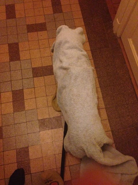 J'avoue, non mais je plaisante, la photo a été prise il y a plusieurs jour déjà, on revenait de balade et il pleuvait des cordes, je lui ai mi sa serviette et j'ai constaté qu'elle ne bougeait plus.