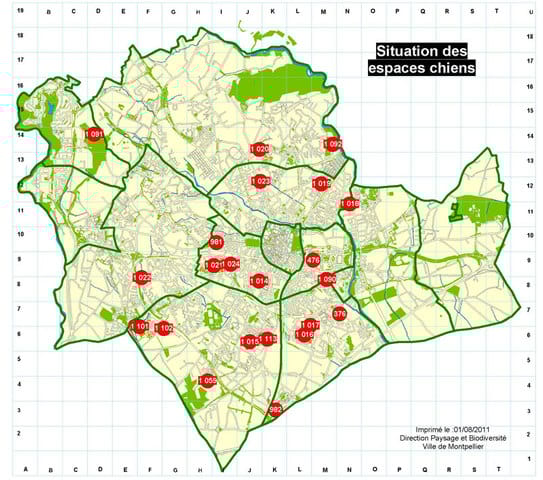 Il suffit de chercher sur Google. En tapant "promener chien montpellier", j'ai trouvé ça : http://www.montpellier.fr/2822-l-animal-en-ville.htm