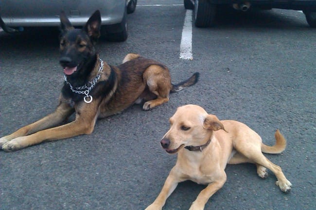 Bref aujourd'hui , il y'a moin de 1 heure , nous etions a la cafétéria de notre ville .... Je venais de finir de manger , j'ai donc décidé de faire une petite balade digestive sur le parking , et là une petite chienne tout jeune , couleur fauve , la queue enroulée , apparait . Bien sur Oslo , voulait jouer .... J'ai donc décider de mettre Oslo dans la voiture le temps d'attraper la petite chienne qui avait manquer de sa faire ecraser .