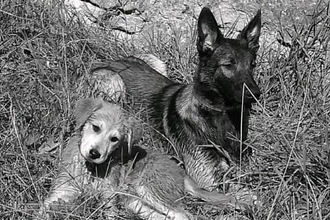 Je l'attrape et va demander a deux jeunes filles qui trainait pres du magasin... Elles me disent que la chienne est la depuis 6 heure , et que personne ne sait a qui elle appartient . Pas tatoué , pas de numéro sur son collier , rien ! Bref on décide de la prendre pour ce soir , et là , depuis une heure c'est que du jeux avec le gros ! AU début un peu trop violent mais avec quelques réprimandes il comprend vite qu'il doit se montrer moin brusque . Mais la petite le cherche et pose ses patte sur ses épaules ... Bref super rencontre ...