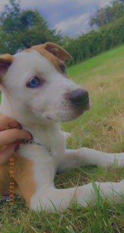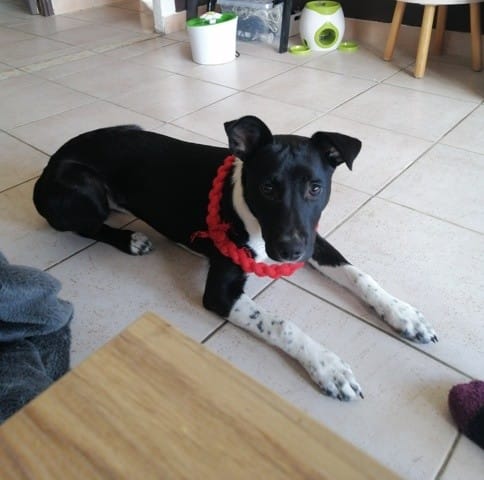 Sa mère est une staff, son père border collie. Elle a hérité de toutes les qualités de ses parents : sportive, docile (très très docile même), calme, patiente, peu destructrice sauf avec ses jouets, aimante.