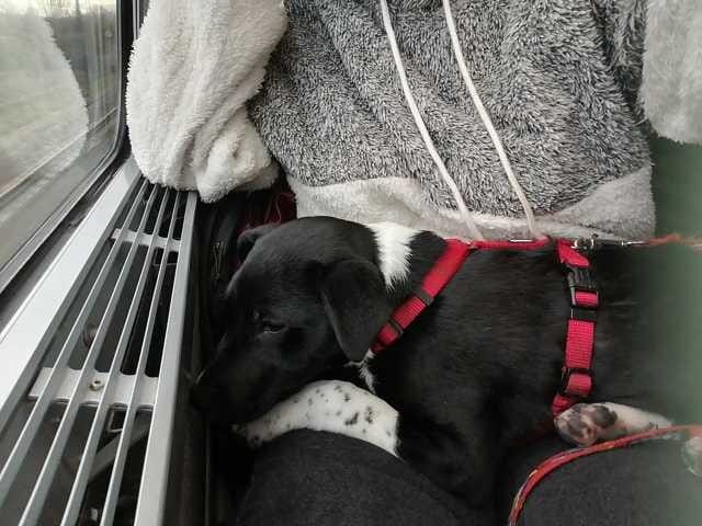 En voiture, elle est calme, tente de temps en temps de bouger mais pas plus, elle se couche en attendant la fin du trajet mais ça ne va jamais au delà de 30mn de trajet. Mais la, les odeurs, les humains inconnu, devoir rester assise.
