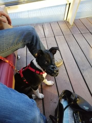 Muselière et laisse histoire que les gens ne boudent pas trop et nous fusille pas du regard.