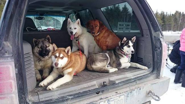 J'ai un gros VUS, un ford expedition, mes 4 chiens sont attaché dans le coffre et mes "invité" sont attaché sur la banquette arrière. J'embarque 5 chiens quotidiennement, parfois 8 et j'ai même monter jusqu'à 11, avec une passagère humaine aha!