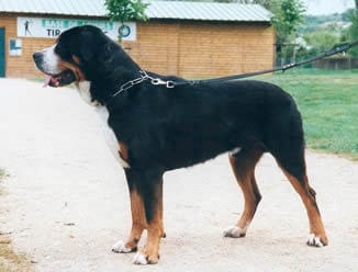 Après, tu as le grand bouvier suisse. Un magnifique chien très typé molosse et très pataud. Celui que je connais à peur de mon chat de 1 kilo et demi et de mes poules 😁