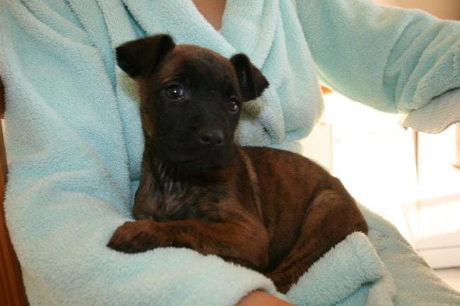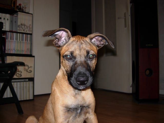effectivement , on dirait un malinois croisé boxer . j 'en ai adopté un de 4 mois en début de semaine , Hiro vient d 'un refuge , il a été trouvé dans un sac ,qu 'on a vu balancé par dessus une clôture de supermarché ....des trois frères , c ' est le plus gros et le plus calme . il dort beaucoup ; comprend vite , obéit très bien même s 'il a tendance a remettre en question les règles assez facilement . Quand je suis seul avec lui , ça roule , mais quand sa maitresse est la , ça part un peu dans tout les sens !