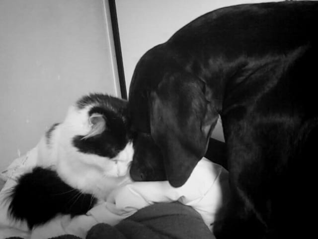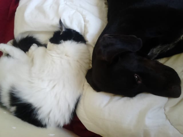 il dort dans ma chambre mais depuis qu'on a essayé de le faire dormir dans le salon il monte sur mon lit quand je dors😔