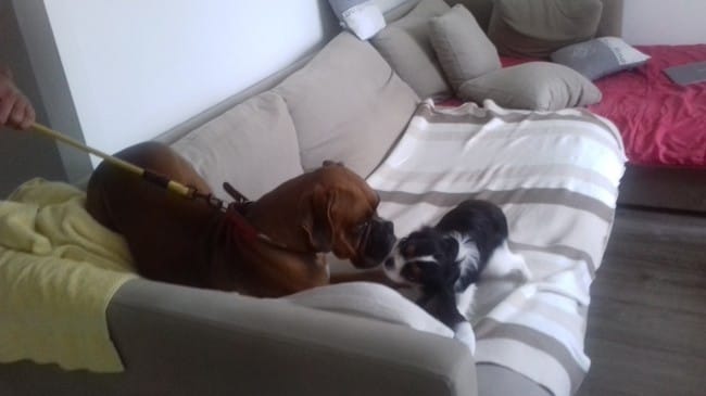 Le soir nous regardons souvent un film dans le lit, elle a le droit de venir avec nous sur le lit. Puis direction le panier au moment du dodo.