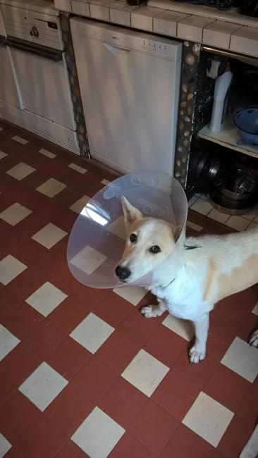 Alors il y a quelque temps Jaa a du avoir une collerette car vilain bobo à cause des puces. Je suis dans la difficulté pour la nourriture les croquettes ne lui conviennent pas... Le petit casse tête du moment.