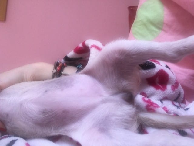 c'est probablement la pigmentation finale qui se met en place, la couleur d'un chiot peut changer legerement (peau et/ou poils) avant d'arriver à l'age adulte.