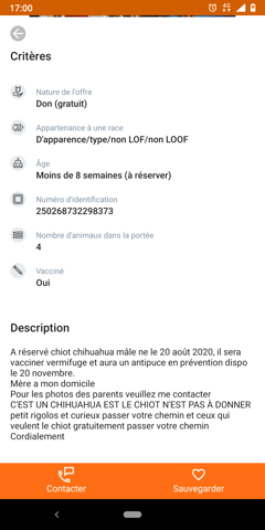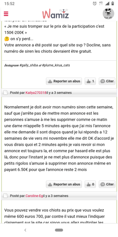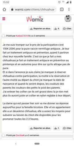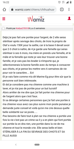 Je leur dit que toutes les femelles sont réserver et qu'il me reste que le mâle, il me dise je préfère une femelle que un mâle donc réserver moi une femelle, je leur dit je vais pas supprimer la réservation d'une personne pour vous faire plaisir c'est que vous êtes intéressé par le mal soit rien. Il me dise tempis alors et vous avez pas le droit de vendre des chiots en temps que particulier. Je leur réponds j'ai mon numéro pour vendre les chiots et c'est la seule portée de l'année et après la mère seras stériliser. Puis 5 minutes après mon annonce est supprimé alors que tout est en accord avec la loi.