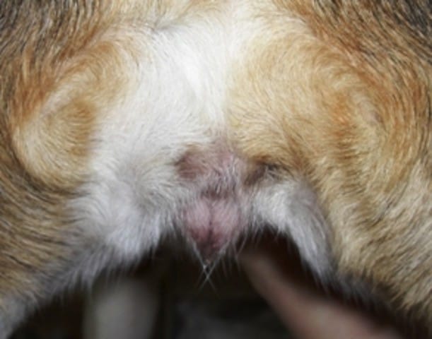La chienne dont j ai vu la meme chose avait une descente du col de l utérus.Médocs et désinfection.Eviter qu elle se leche a cet endroit,ca peut etre douloureux. gigi397