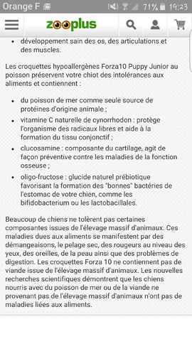 Merci beaucoup de vos conseils alors je lui ai donné de l'anti puce nex gard car il en avait je lui ai donné dimanche et le vermifuge lui avait été donné jeudi milbemax J'espère trouver rapidement les croquettes adaptés pour lui petit père ça nous ennuie de le voir se gratter comme ça. Je viens de regarder la composition de forza 10 et c'est vrai que pourtant ça a l'air d'être un bon produit je veux pas lui faire essayer 36 marques avant de trouver la bonne je tiens pas à changer tous les 4 matins à le perturber à ce niveau là :/ je vous mets une petite photo de ce qu'ils disent concernant forza 10