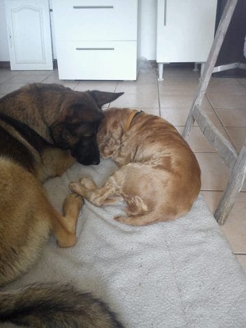 Passé l’excitation d'harkos les 2 premiers jours a vouloir jouer avec elle, il l'a laisse tranquille et l'a surveille c'est trop mignon !