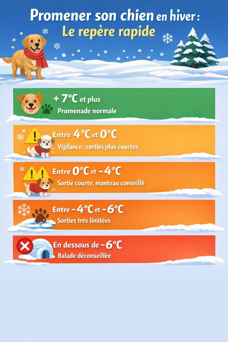 À ce stade, les promenades longues sont déconseillées pour la majorité des chiens. Même les animaux robustes peuvent souffrir du froid s’ils restent immobiles ou exposés trop longtemps.